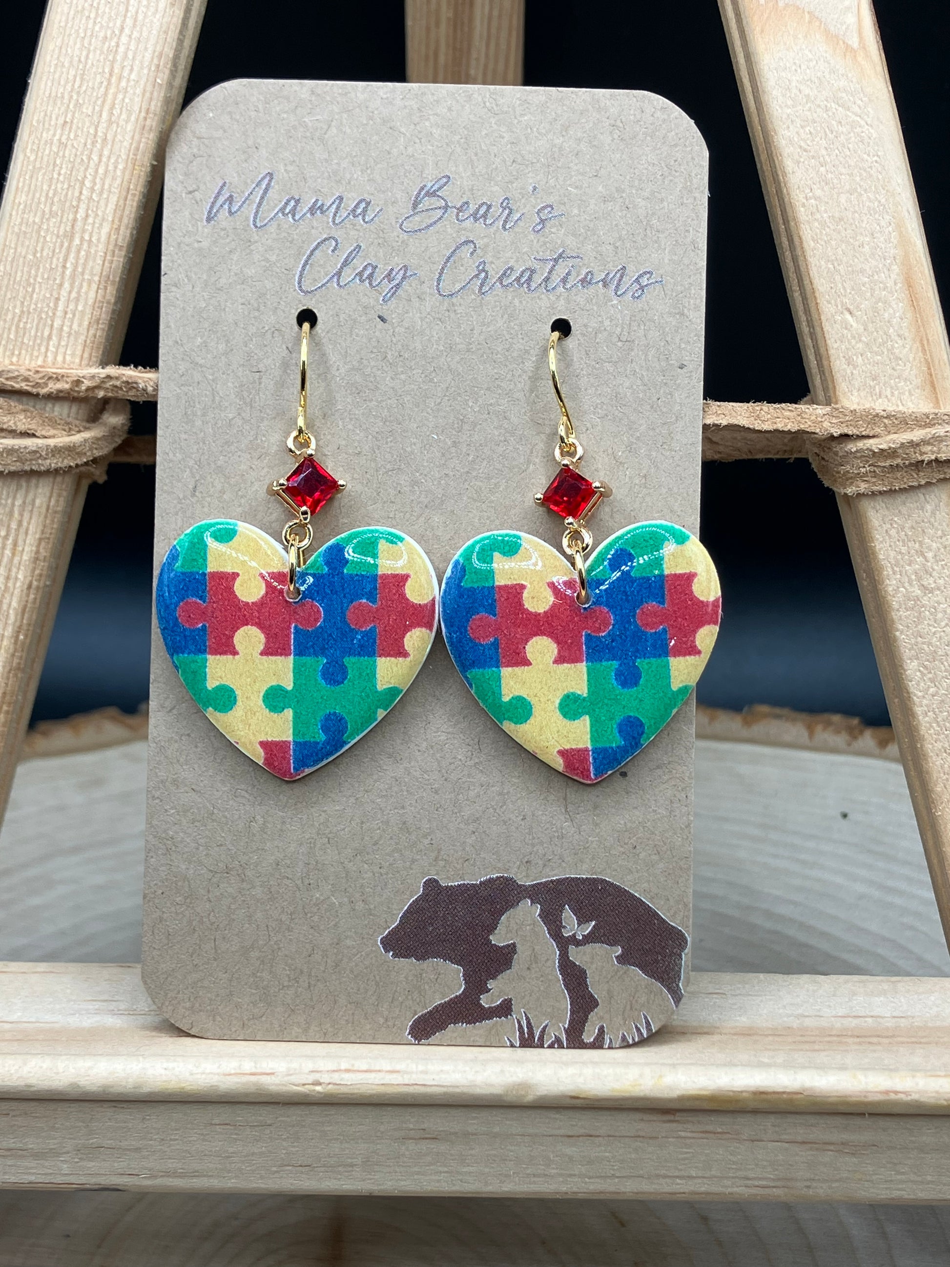 Autism awareness puzzle hearts. Topped with resin for high gloss shine. Gold plated findings. 1.75” complete.