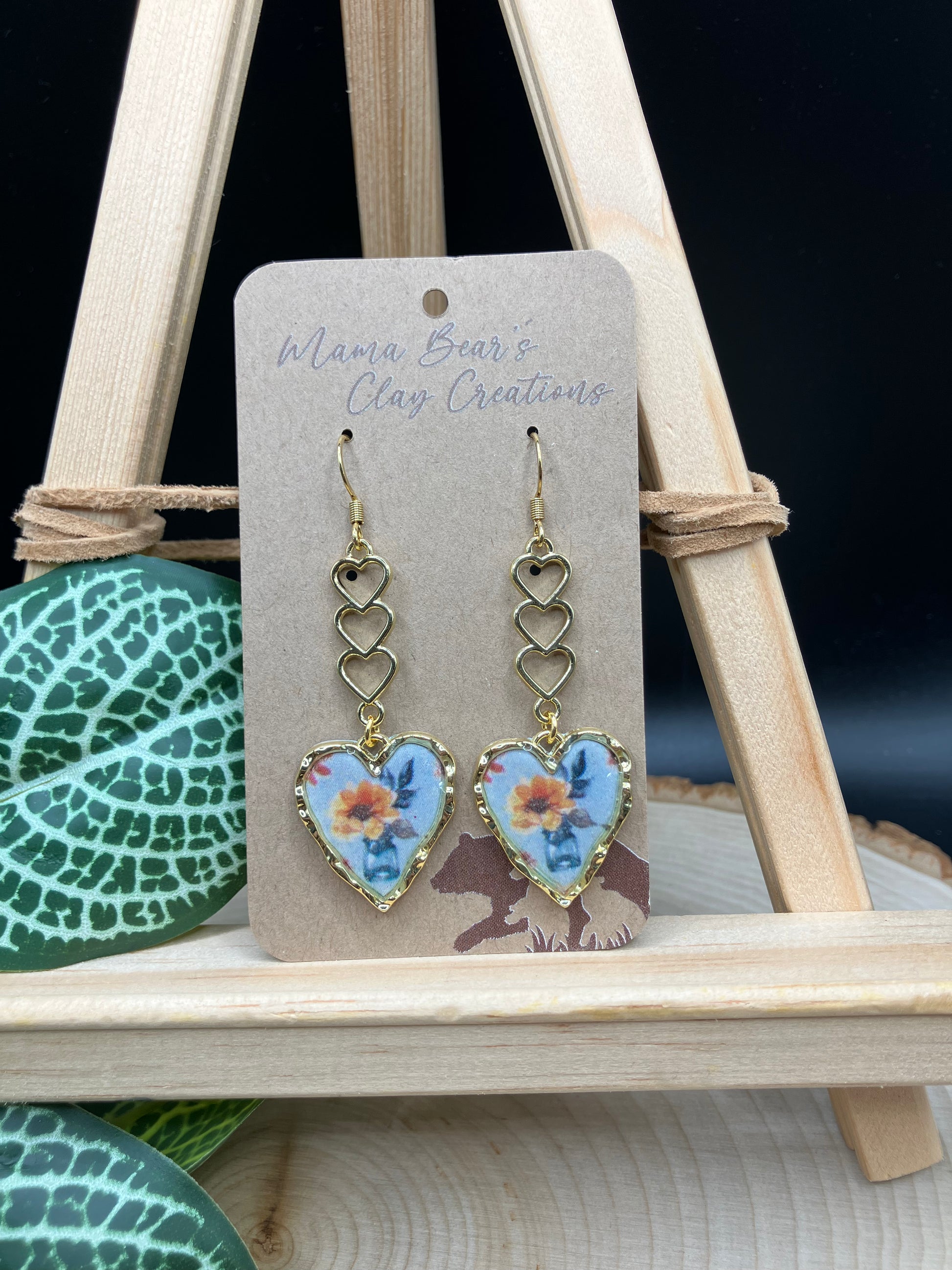Daisy arrangement printed pattern topped with resin for a high gloss finish. Smooth finished blue backing. Gold plated earwire with chain of hearts connector to heart bezel. 2.25” complete.