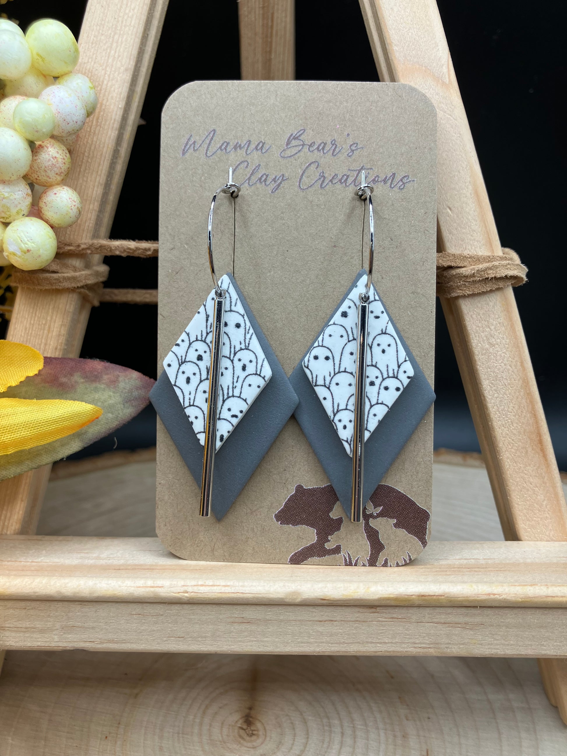 Stacked clay diamonds on stainless steel hoops with coordinating bar charm. 2.5" complete.