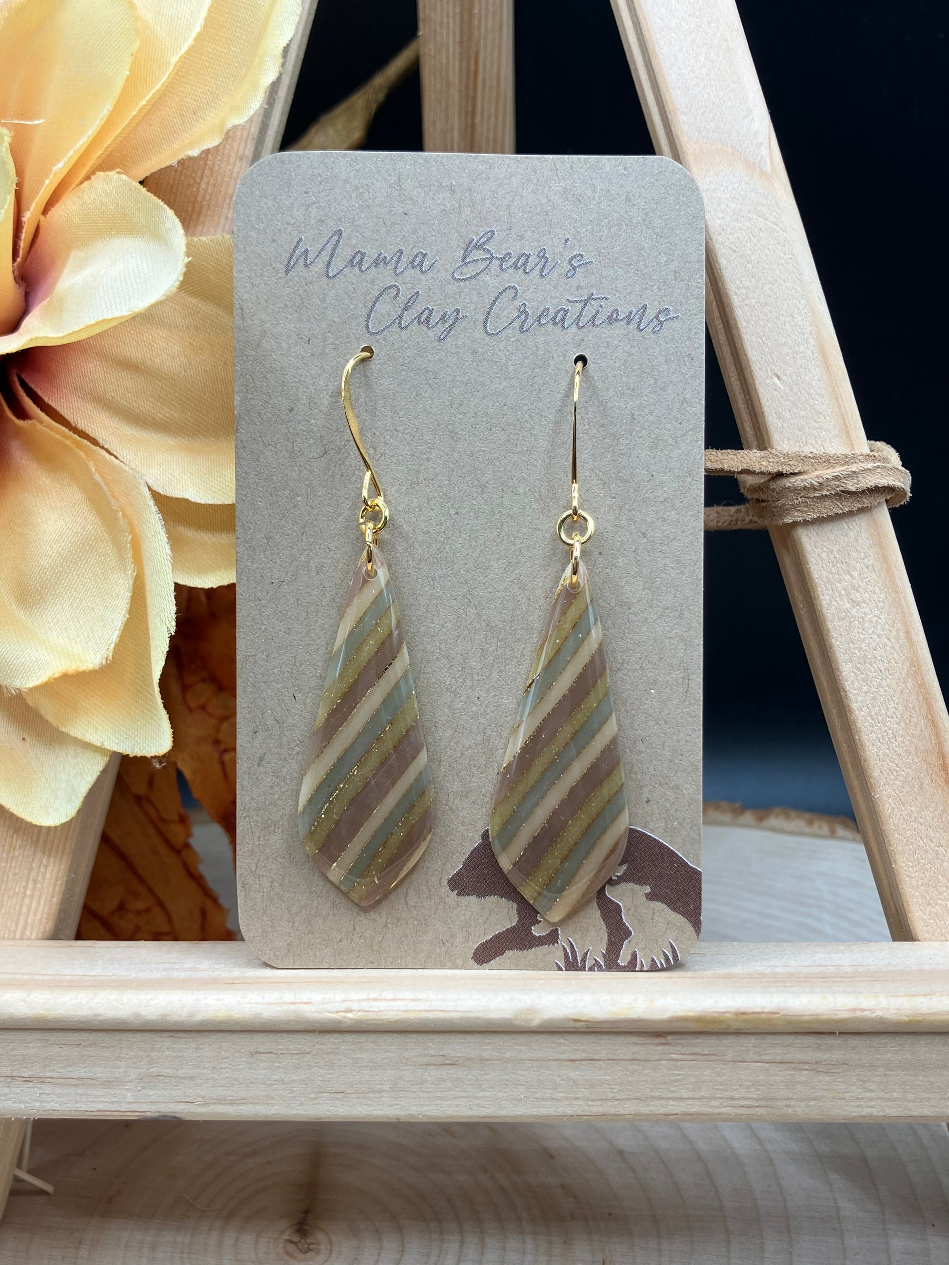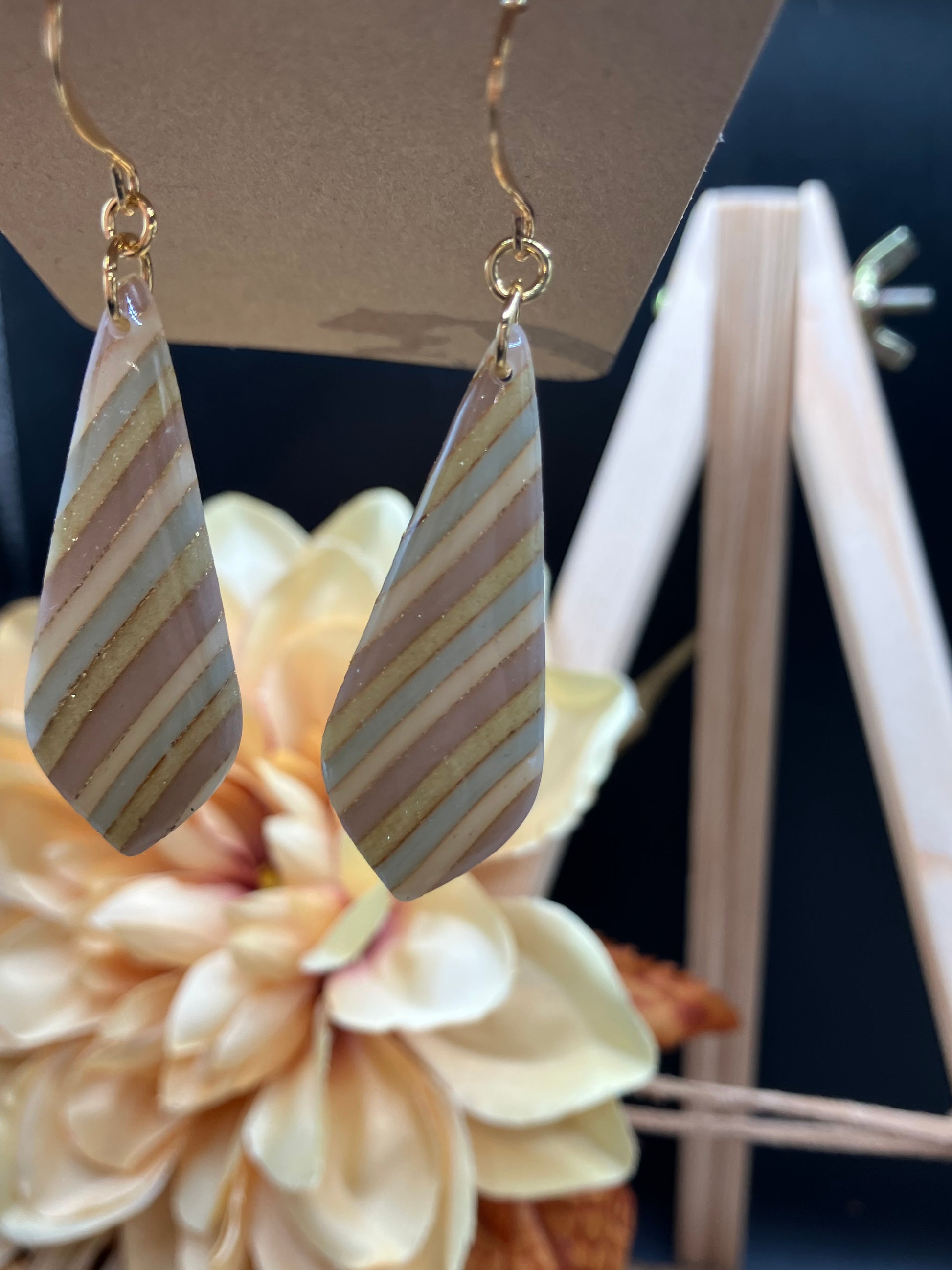 Translucent stripes of tan, green, gold glitter and chocolate separated by gold leaf foil. Topped with resin for high gloss shine. The sun really catches these! Gold plated findings. 2.5” complete.