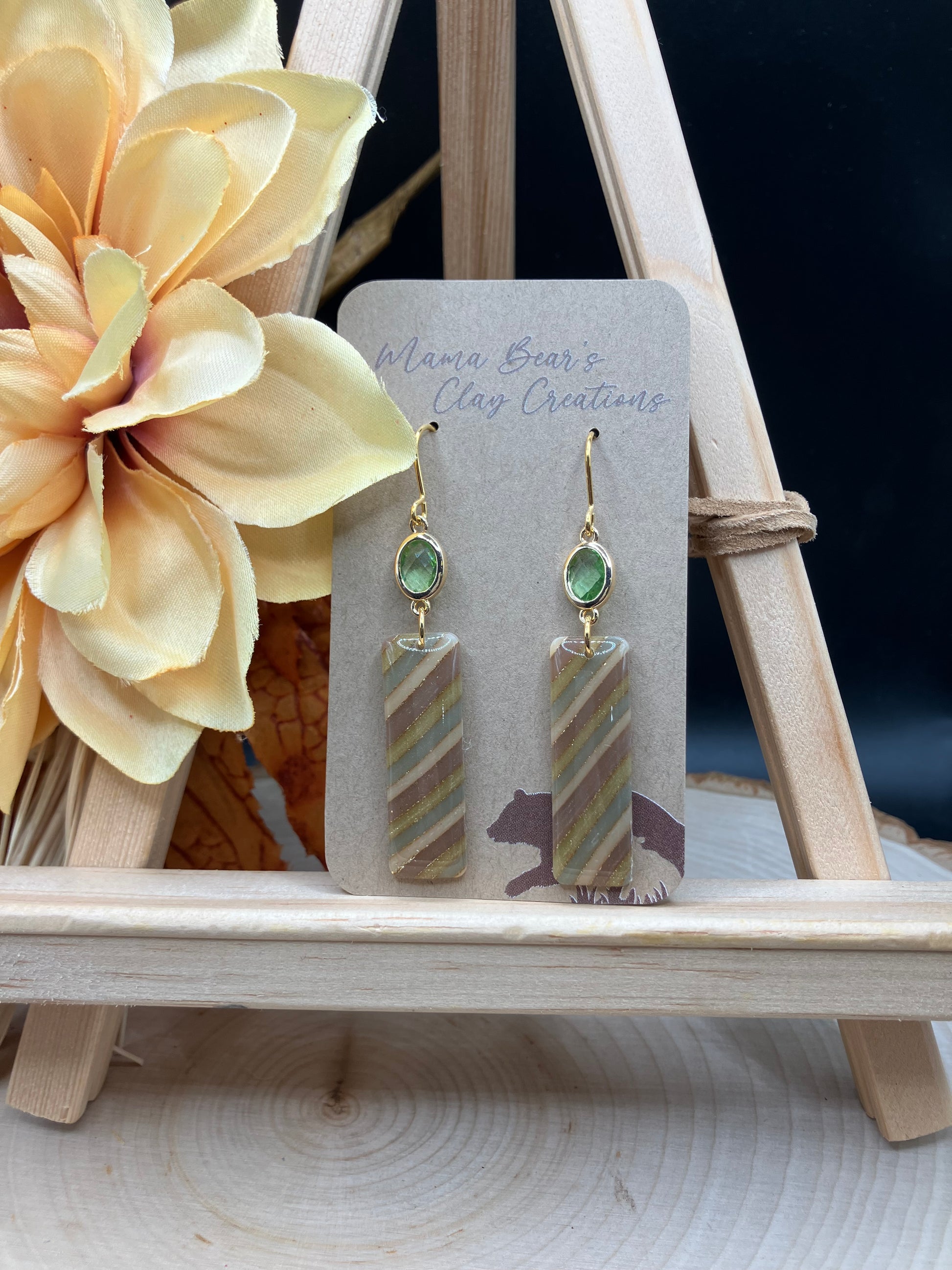 Translucent stripes of tan, green, gold glitter and chocolate separated by gold leaf foil. Topped with resin for high gloss shine. The sun really catches these! Gold plated findings. 2.5” complete.