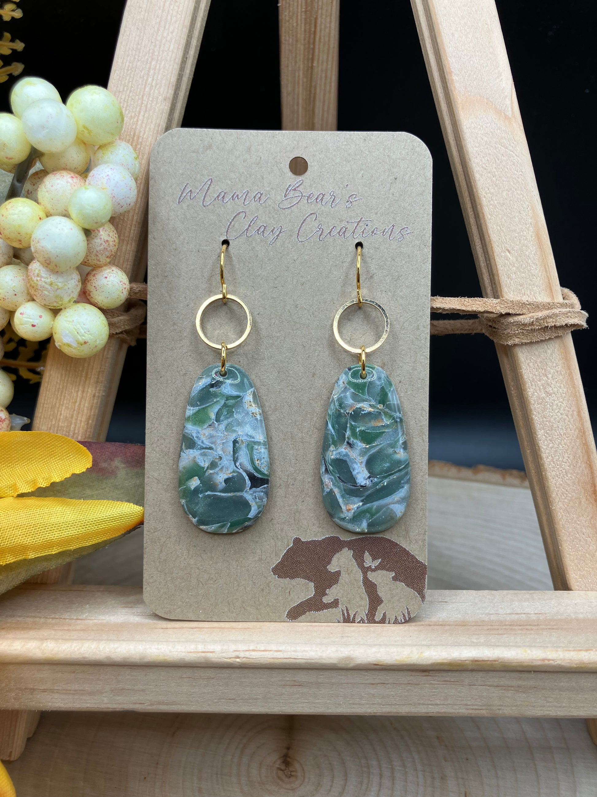 Custom tinted translucent pearl, emerald and black clay with gold shimmering accents. Gold plated findings. 2" complete.