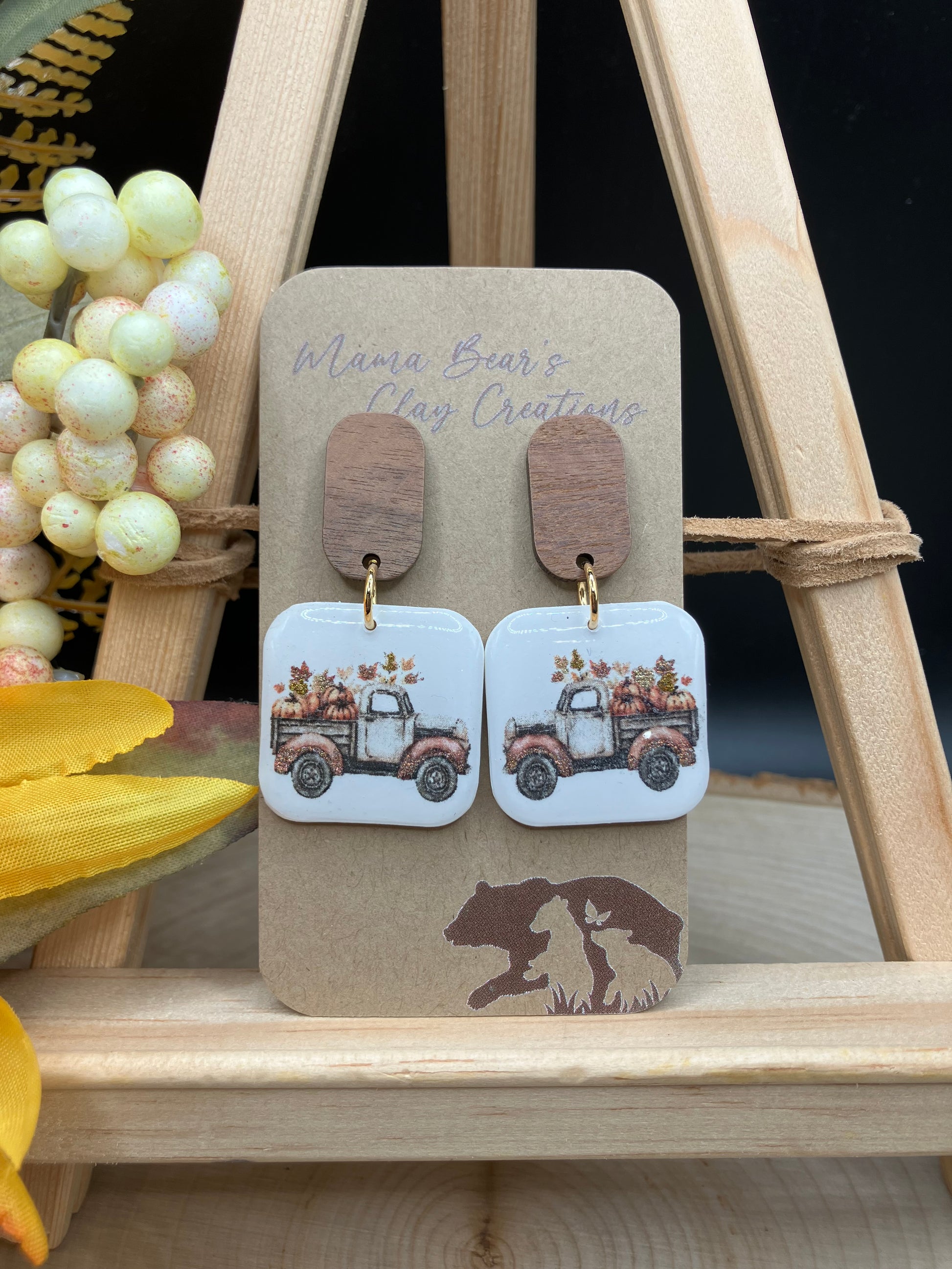 Fall truck with hand painted holographic accents on leaves and fenders. Topped with resin for high gloss shine. Wood post. 2" complete.