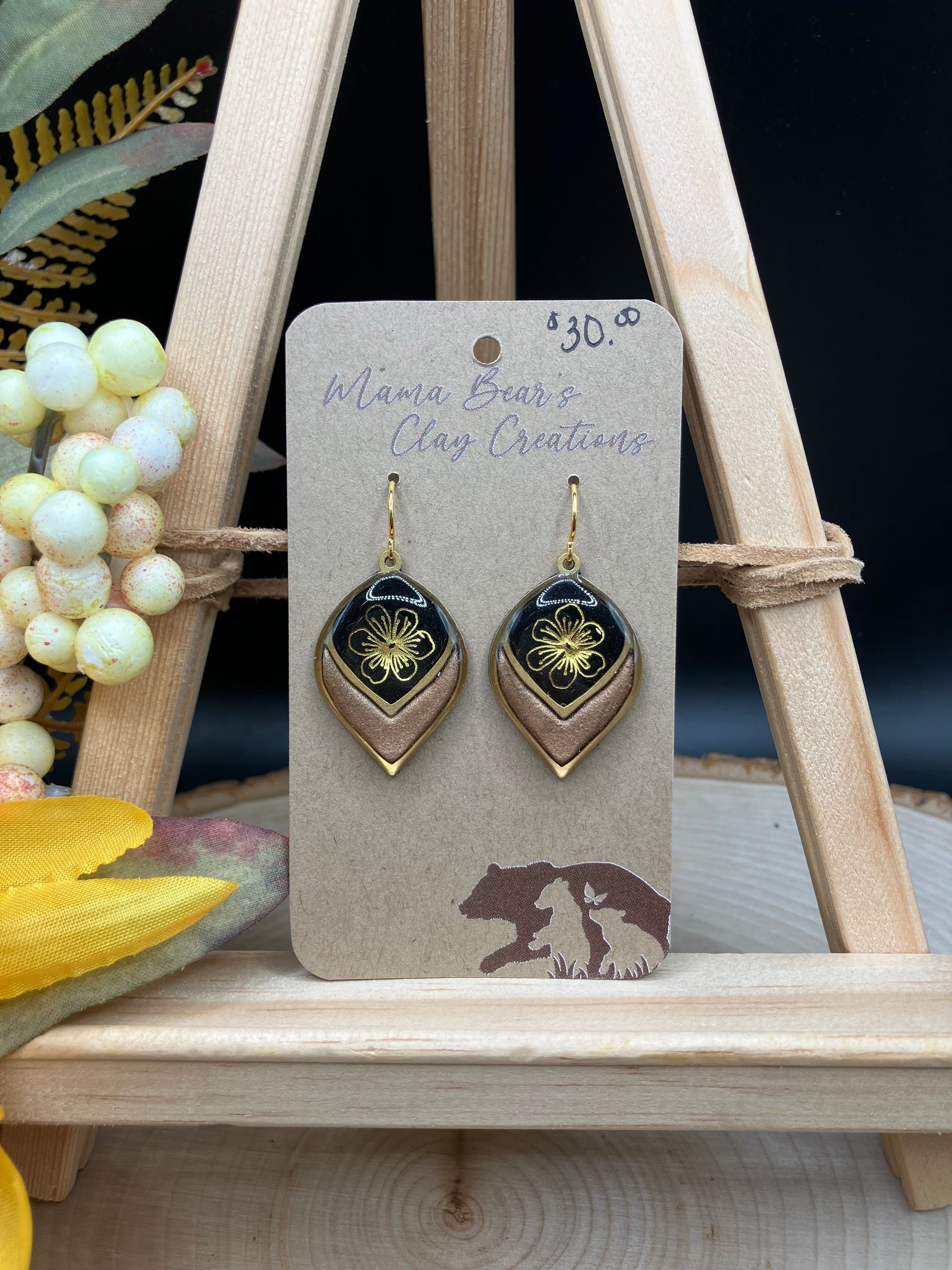 Brass bezel with two tone black and bronze. Gold foil inlay flower. Topped with resin for high gloss shine. Gold plated findings. 1.5” complete.