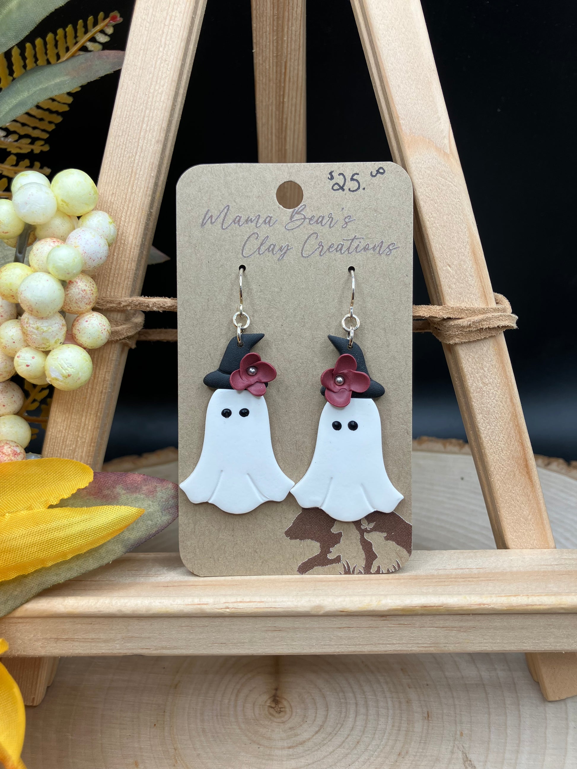 Flowy floral ghost with burgundy flower and witch hat. Silver plated findings. 2” complete.