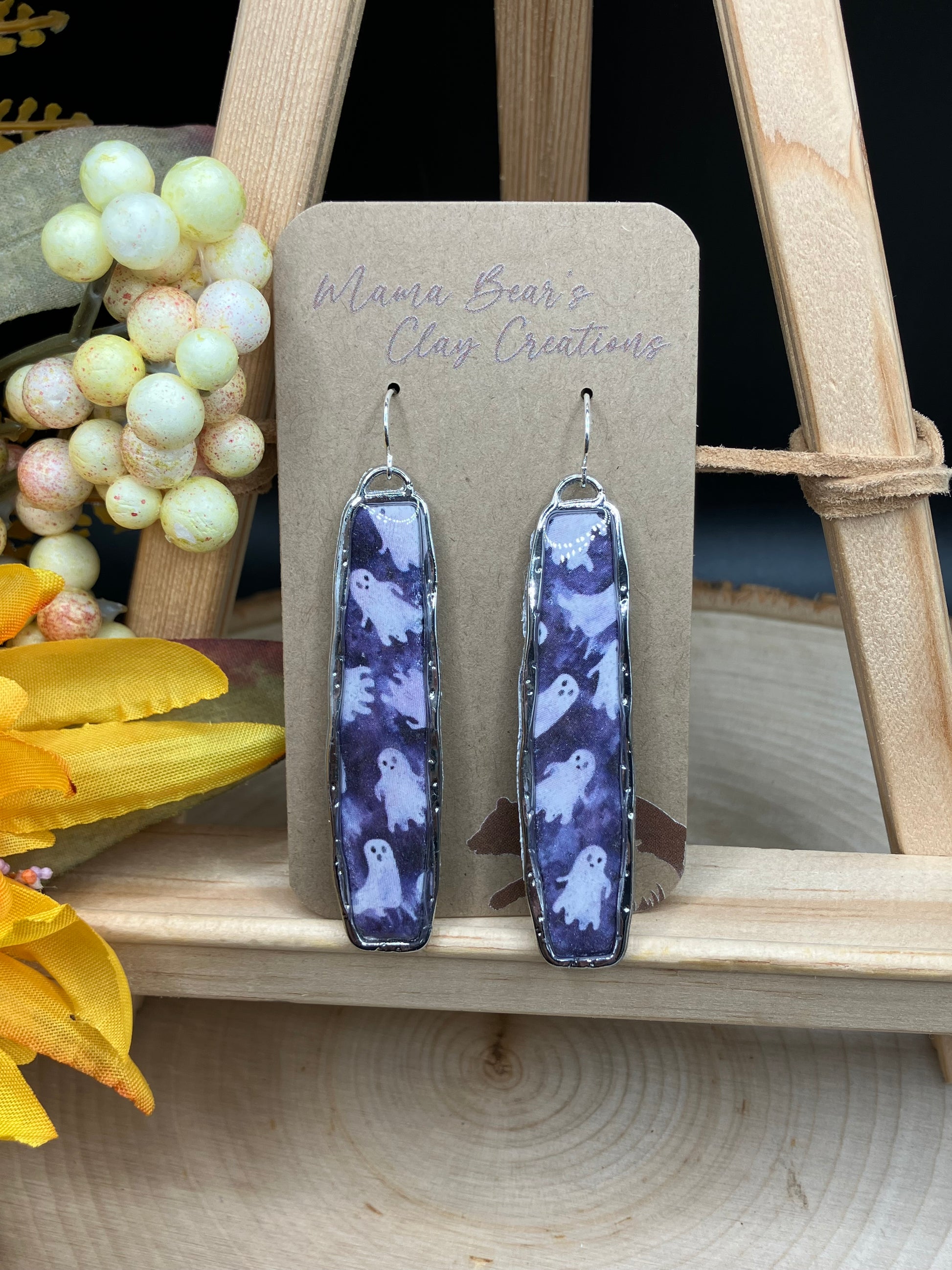 Ghost pattern inside stainless bezel. Topped with resin for high gloss shine. Silver plated earwire. 2.75" complete.
