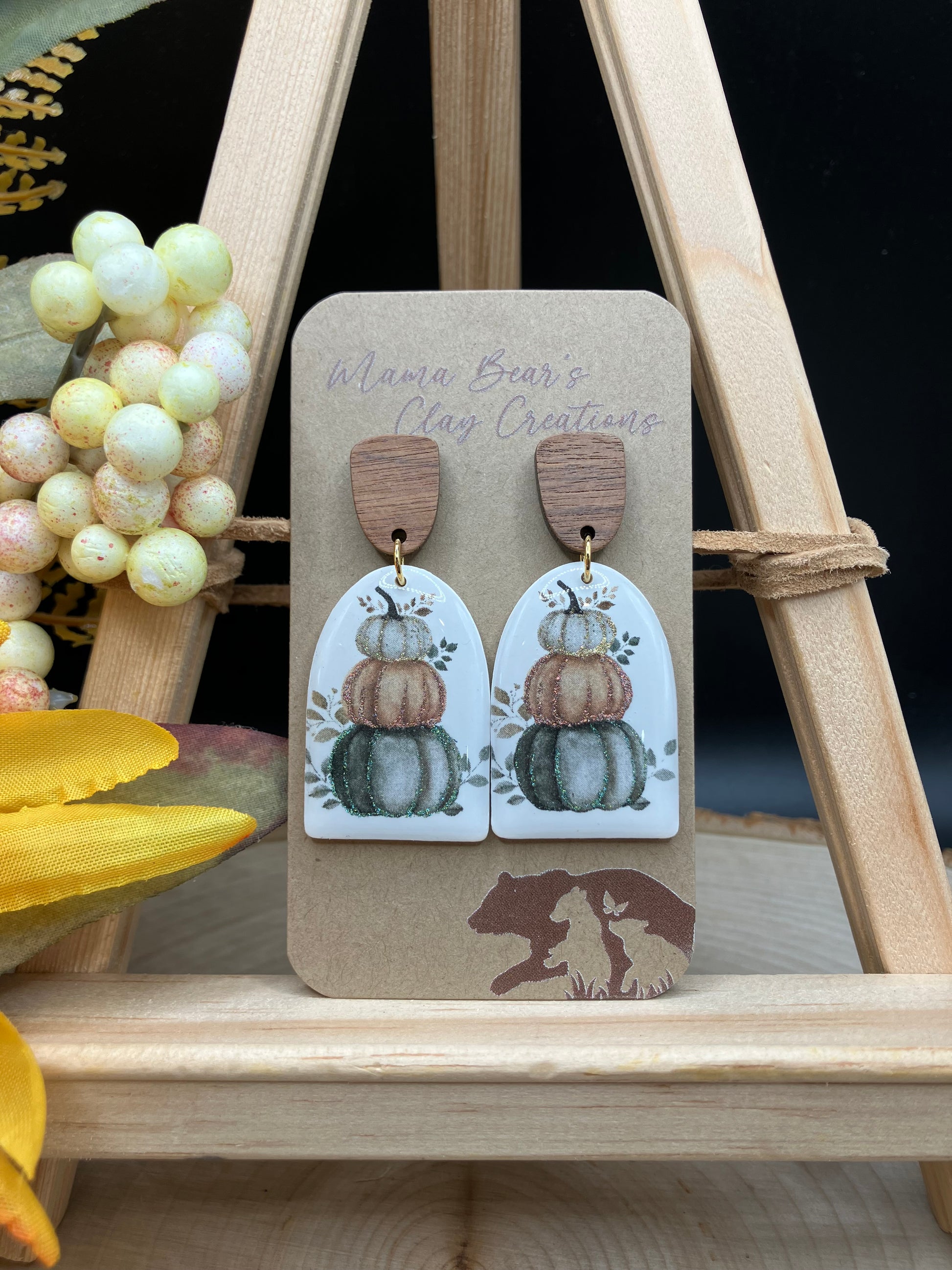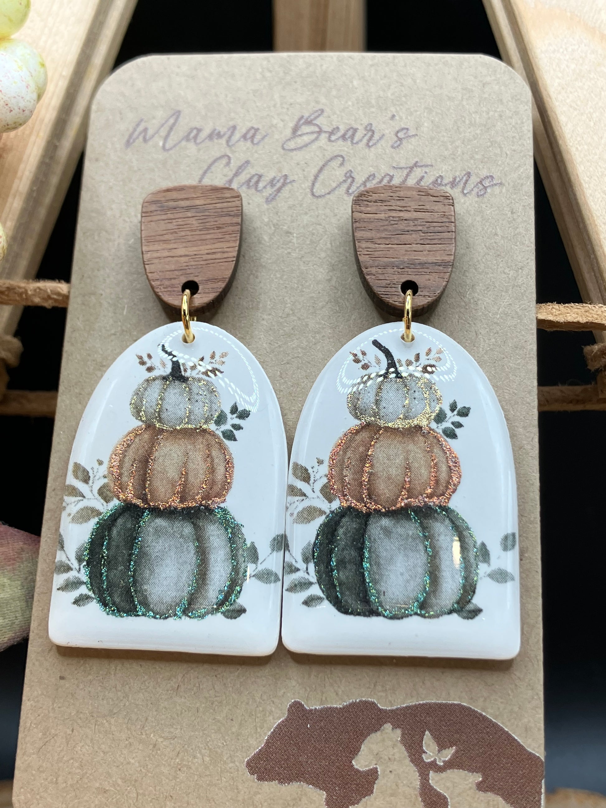 Triple stack of pumpkins hand painted with holographic paint. Topped with resin for high gloss shine. Wood post. 2" complete.