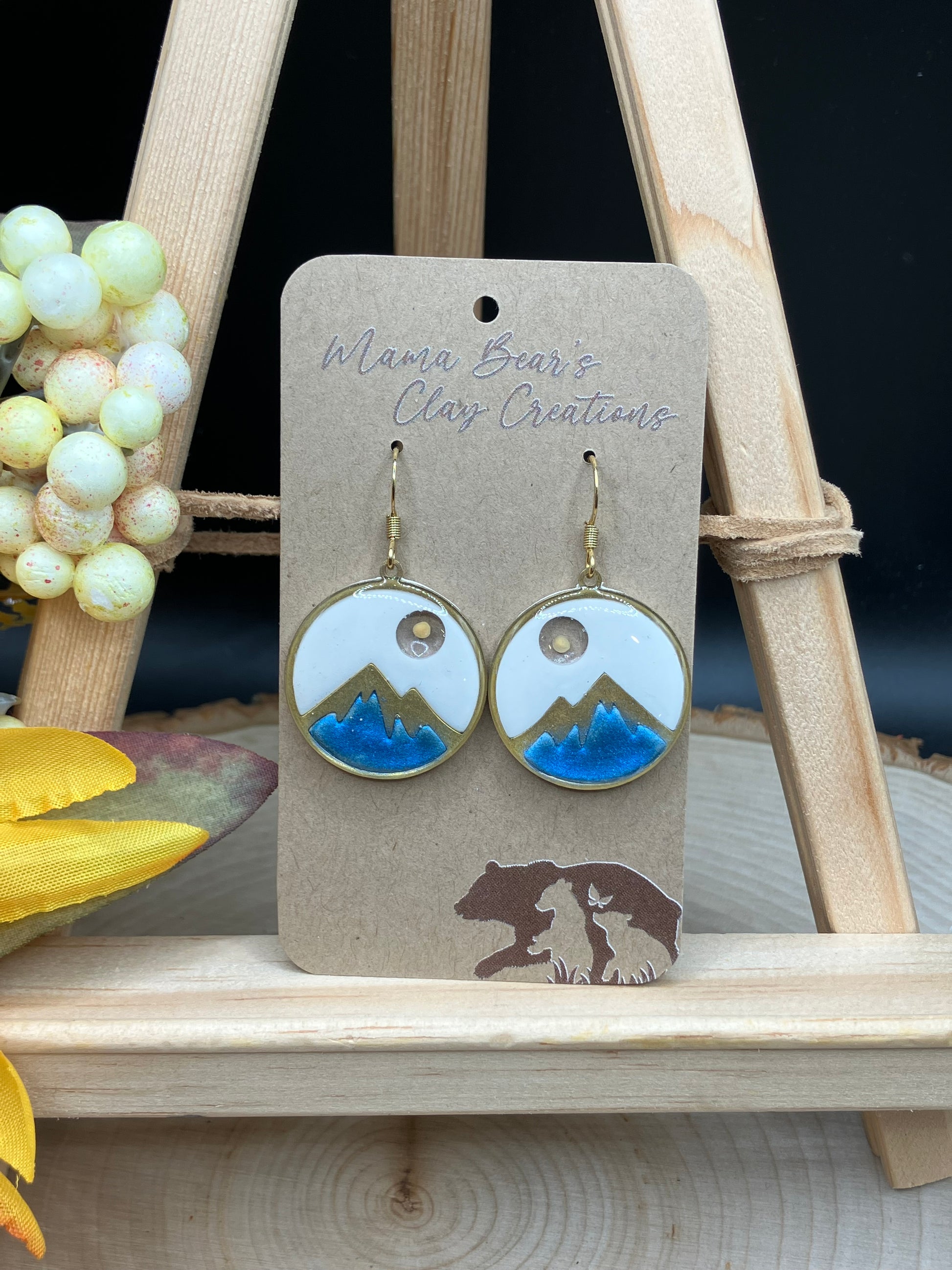 Brass bezel with metallic shimmer mountain. Real embedded mustard seed design. Topped with resin for high gloss shine. Gold plated findings. 1.5” complete.