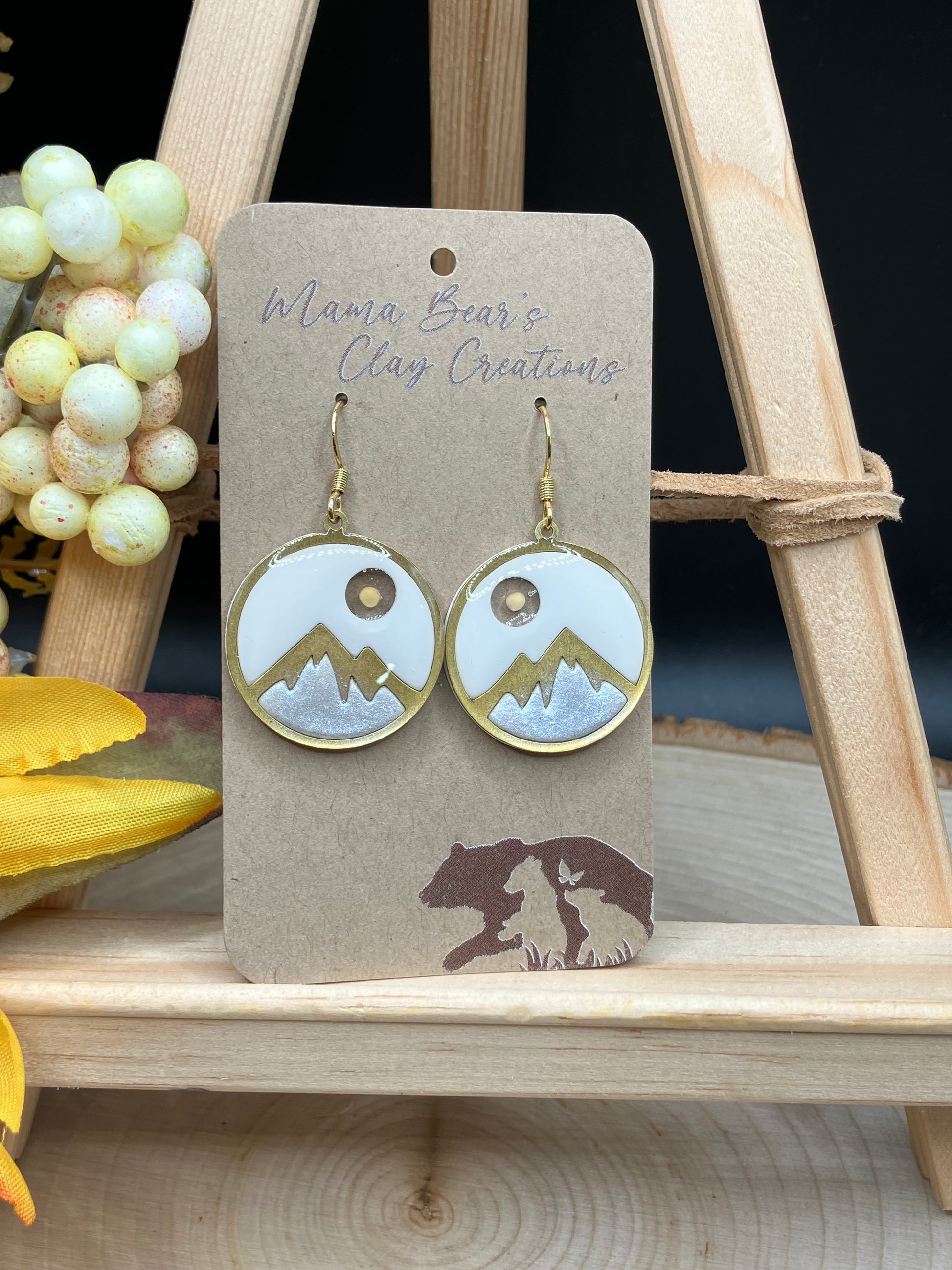 Brass bezel with metallic shimmer mountain. Real embedded mustard seed design. Topped with resin for high gloss shine. Gold plated findings. 1.5” complete.