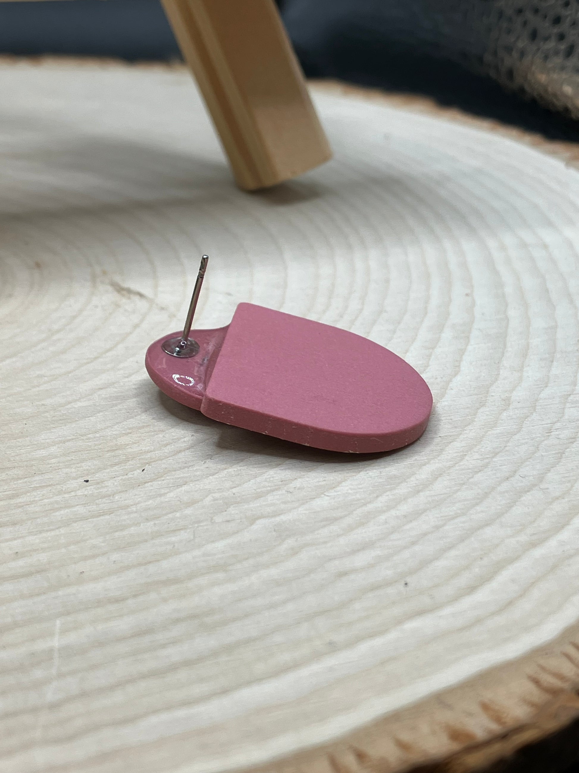 Pink base with cream floral pattern topped with resin coated circle on these statement studs. 1.25” long by 1” wide.