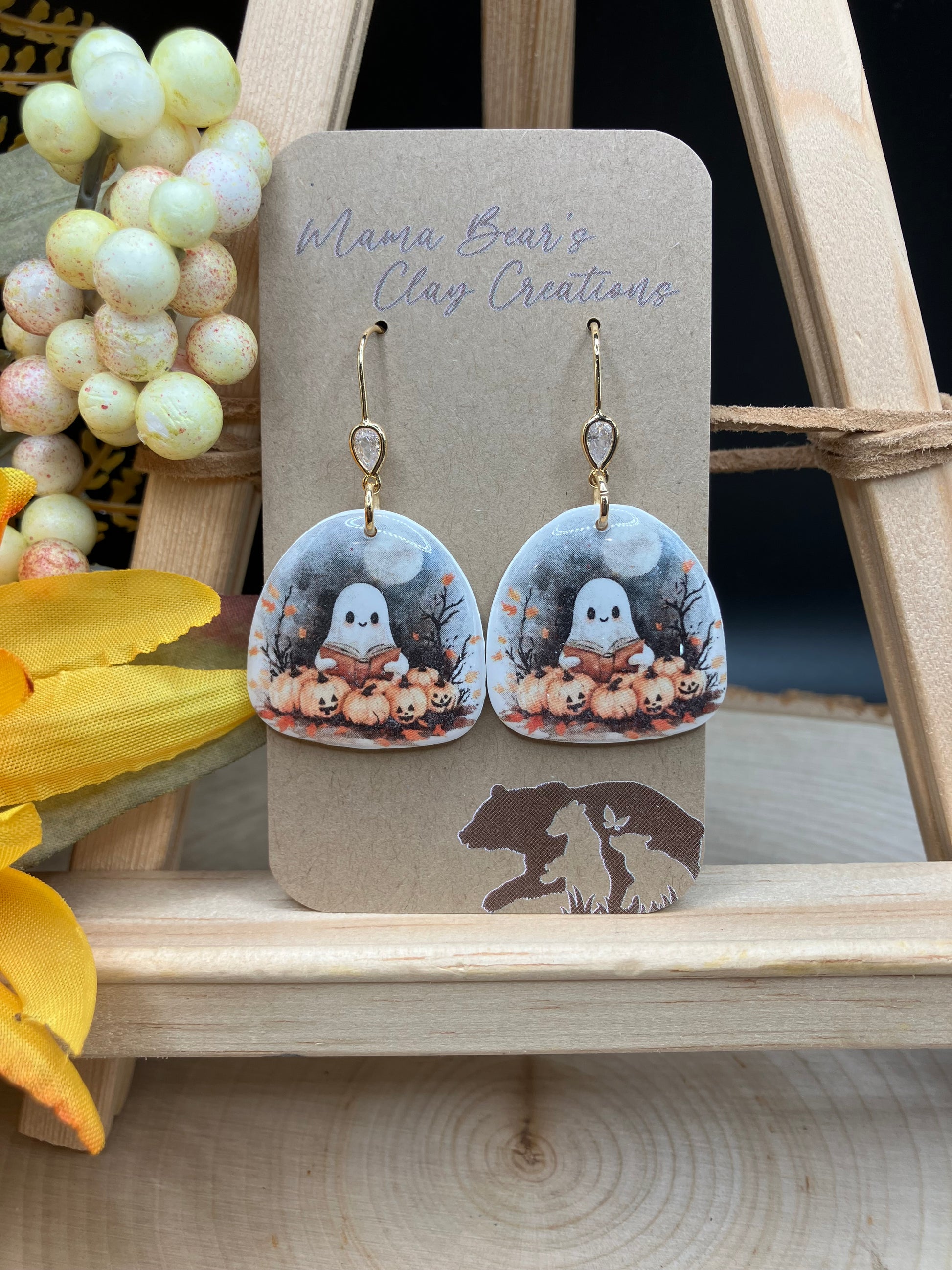 Adorable ghost reading a book with pumpkins. Topped with resin for high gloss shine. Topped with a gold plated earwire. 1.75" complete