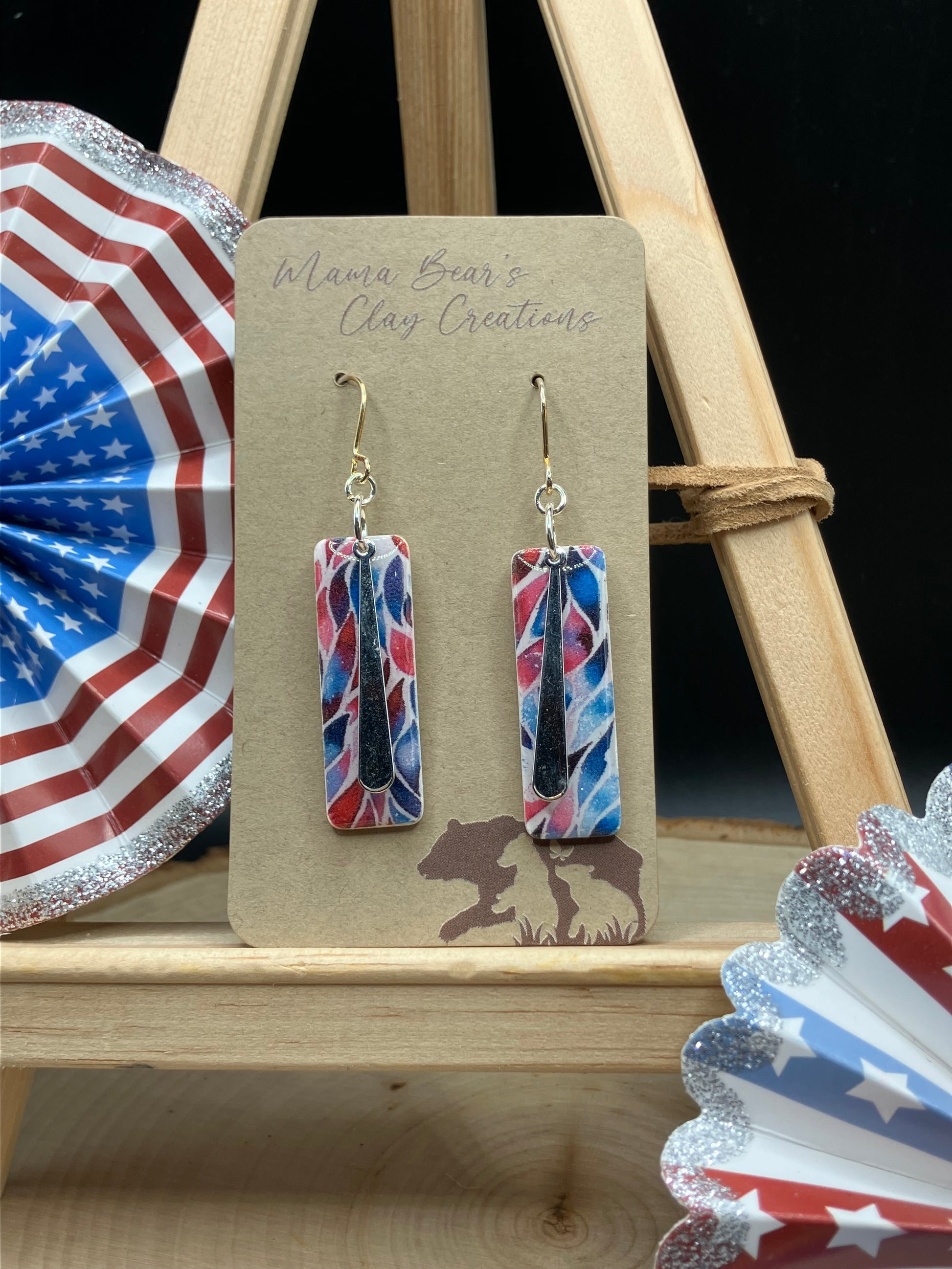 Red, white and blue pattern. Topped with resin for high gloss shine. Silver plated findings. 2.25” complete.
