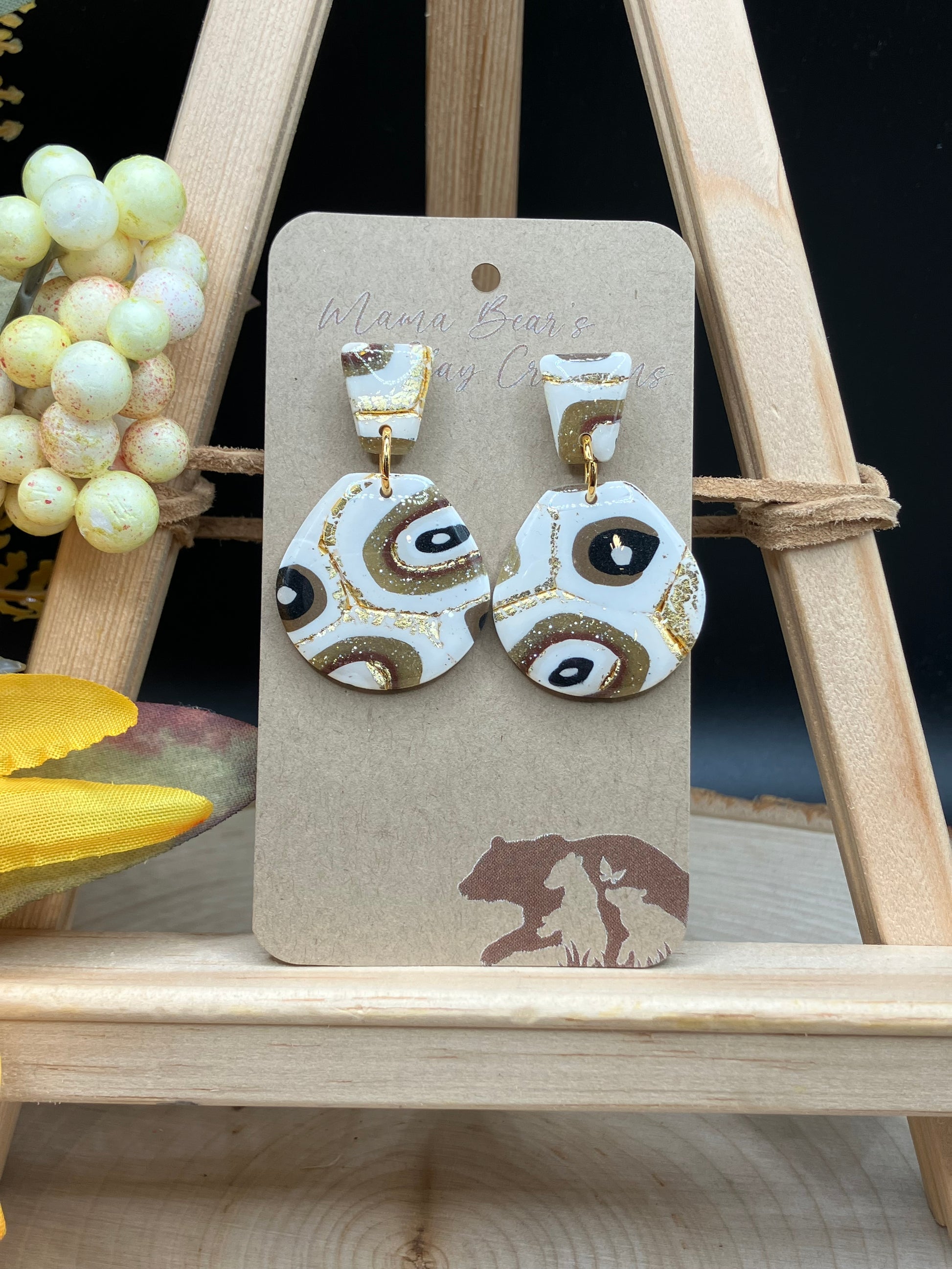 Combination of white, black, gold glitter, chocolate clay with gold leaf accents. Topped with resin for high gloss shine. Coordinating clay top with gold plated post. 1.5” complete.