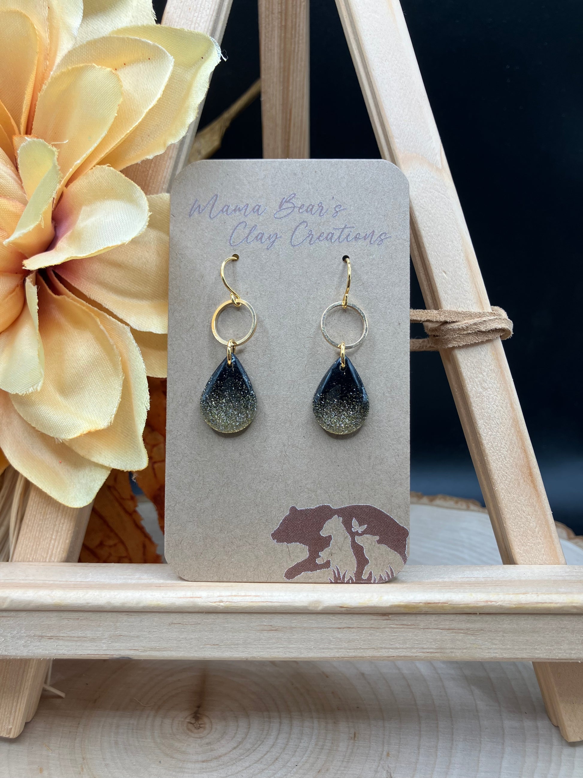Black and gold glitter ombré. Small dainty earrings. Gold plated findings. Resin topped for high gloss shine. 1.5” complete.