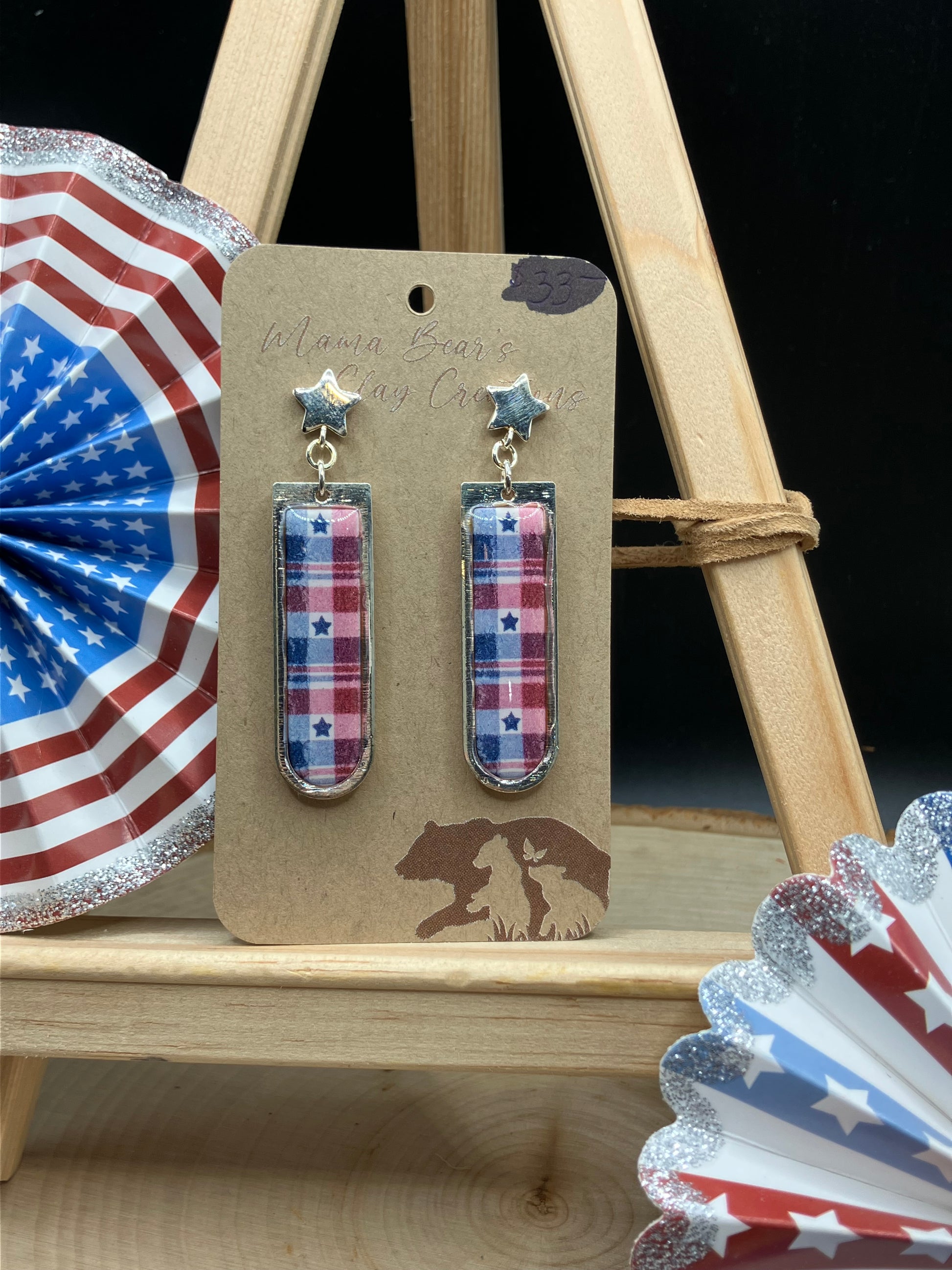 Rustic patriotic plaid. Topped with resin for high gloss shine. Silver plated findings. 2” complete.