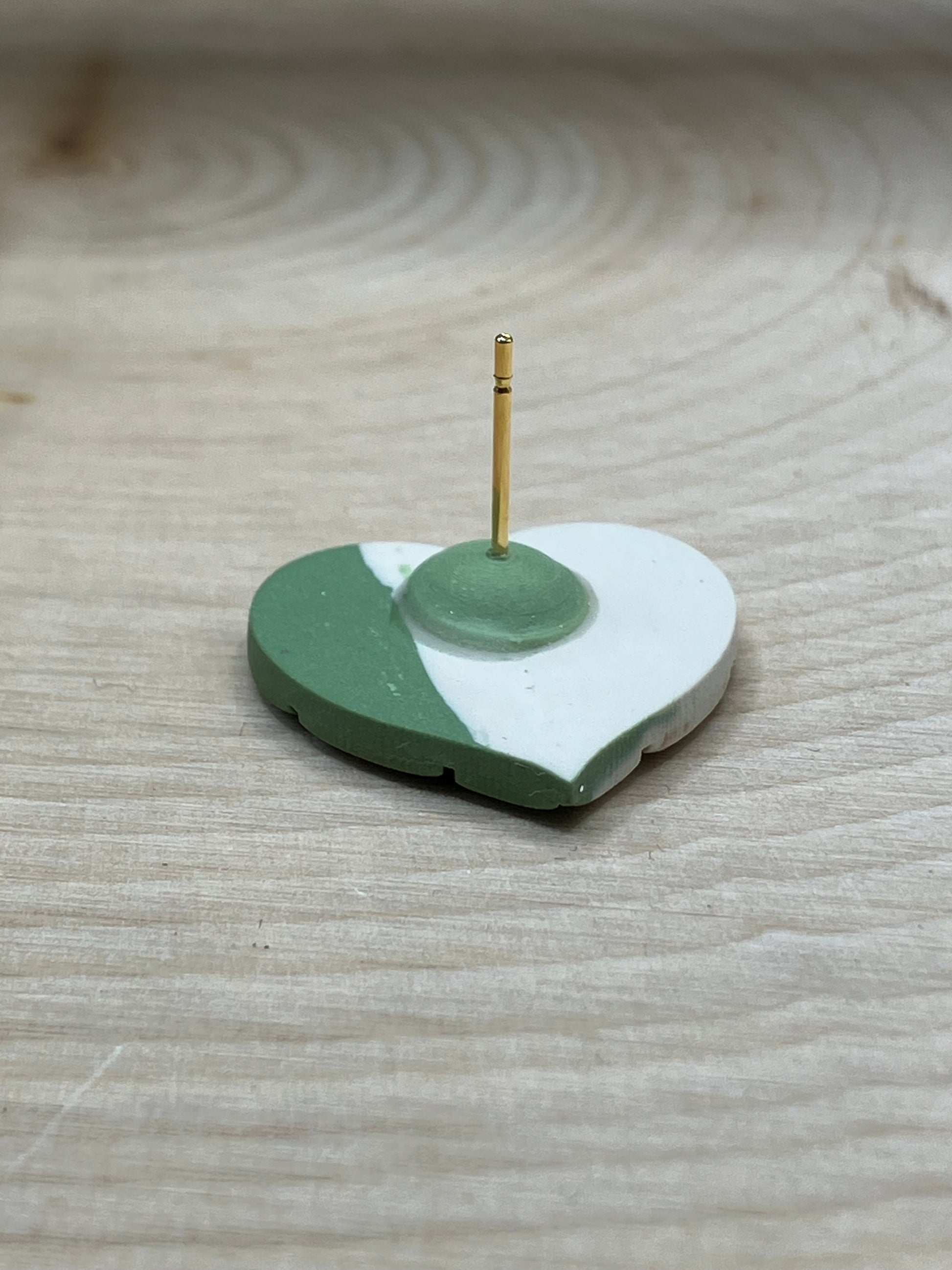 Two toned green and beige leaf studs. More than one available, pattern may vary slightly. Mirrored colors. 3/4” wide and long. Clay embedded post for durability, comfort and professional finish.
