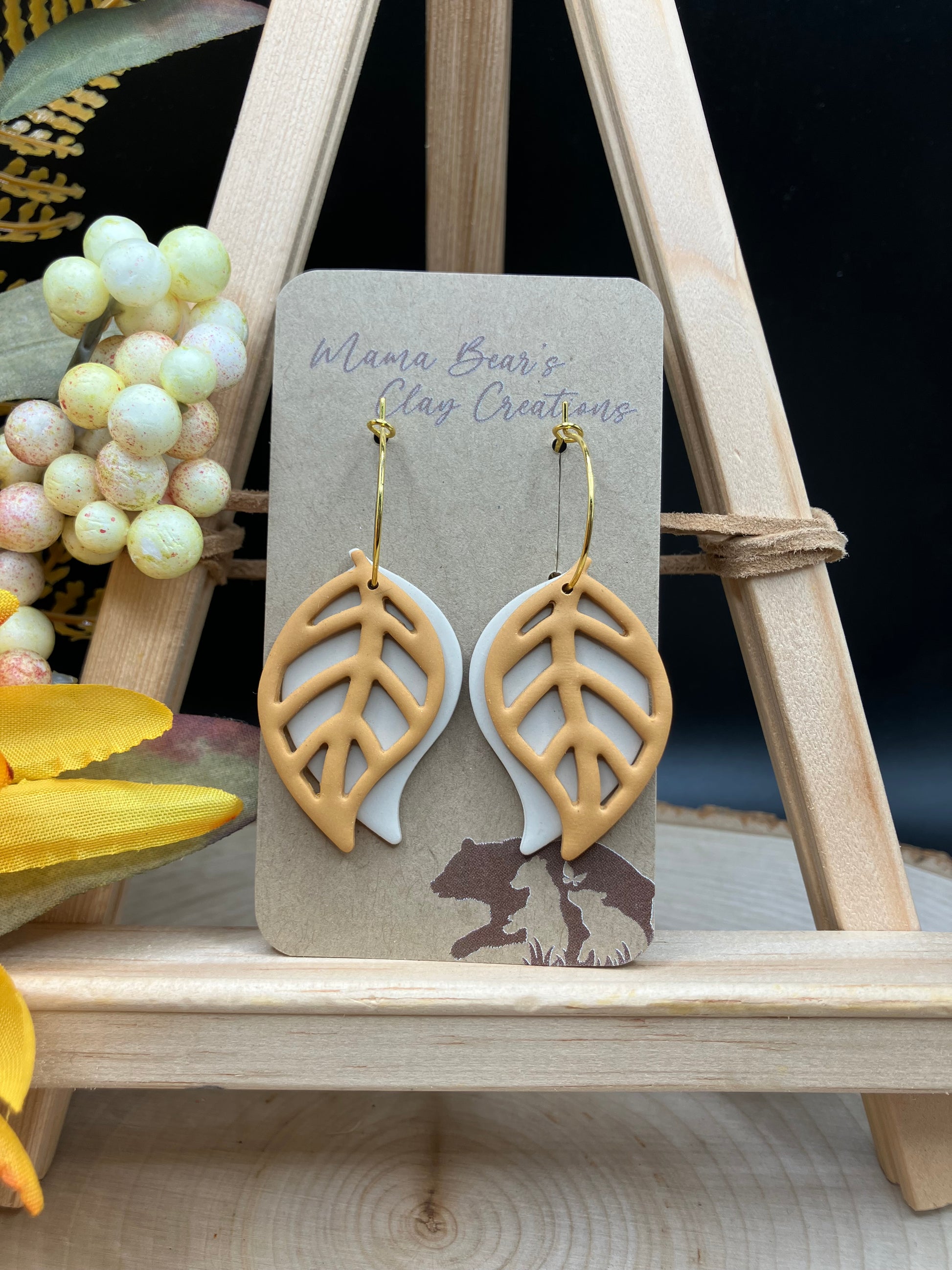 Dual layer leaves on hoops. Beige base layer. Mustard cut out top layer. Gold plated hoops. 2" complete.