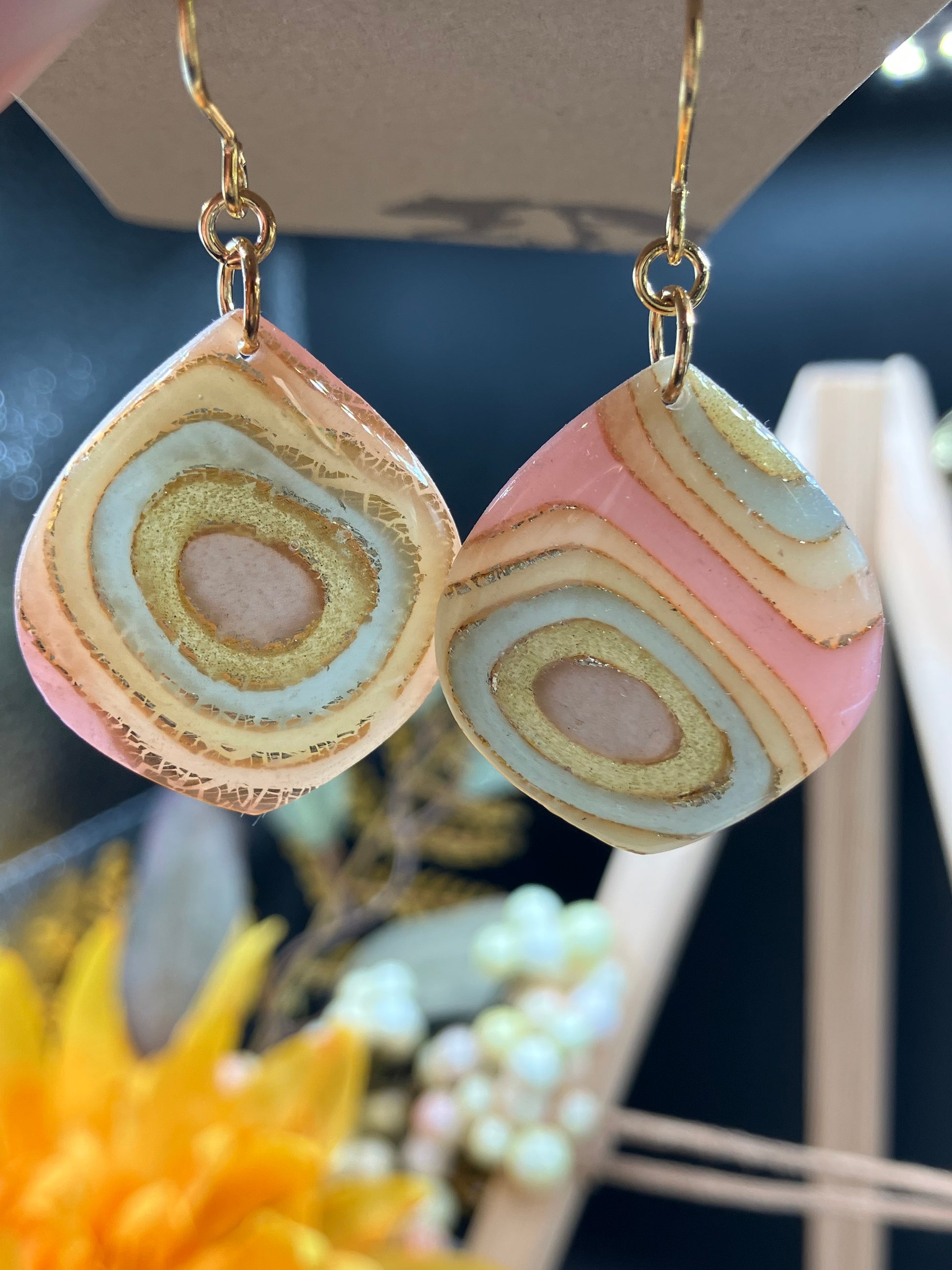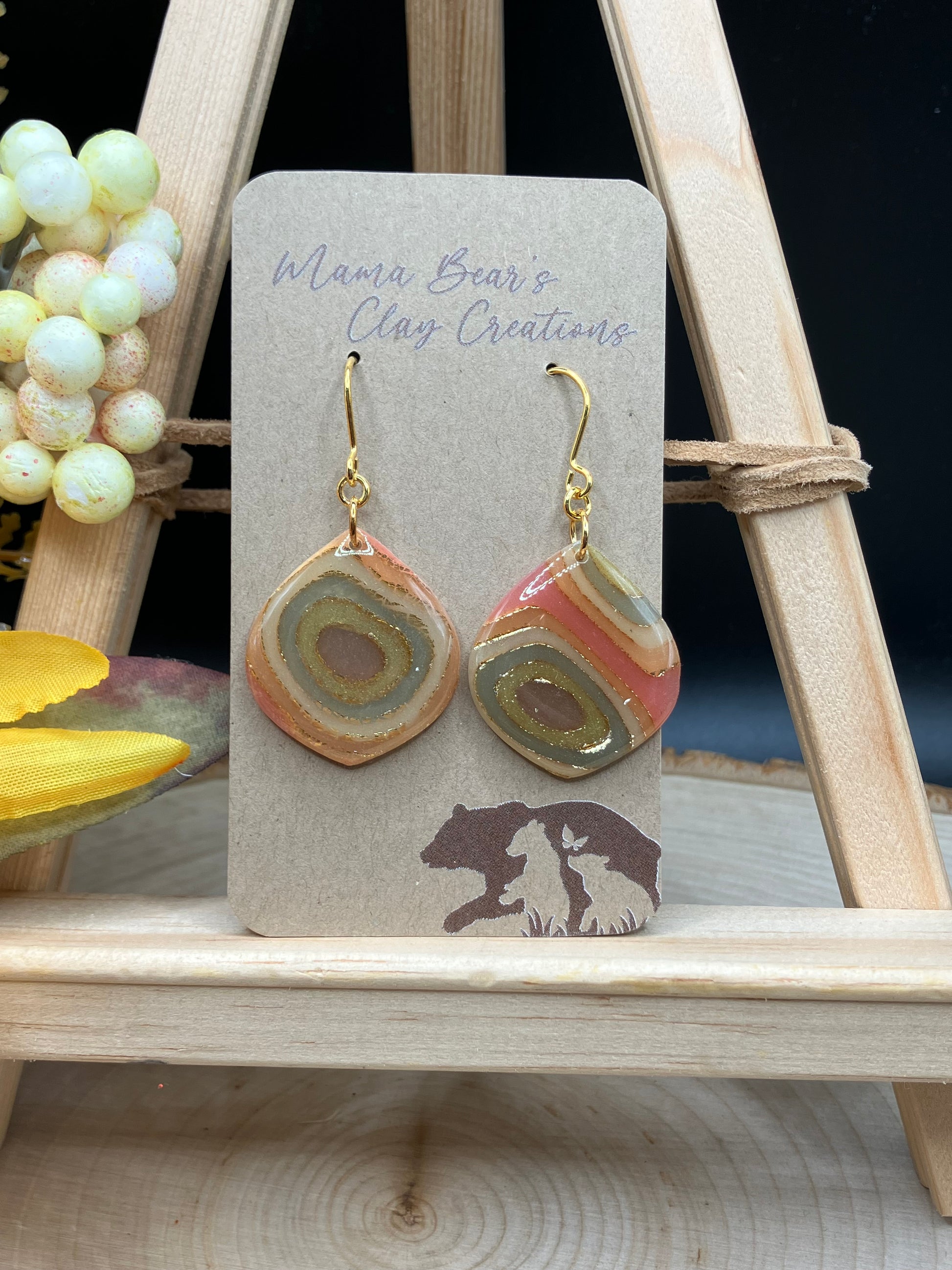 Custom tinted translucent earthy tones of red, orange, yellow, green and chocolate clay with layers of gold shimmering accents. Gold plated findings. 2" complete.