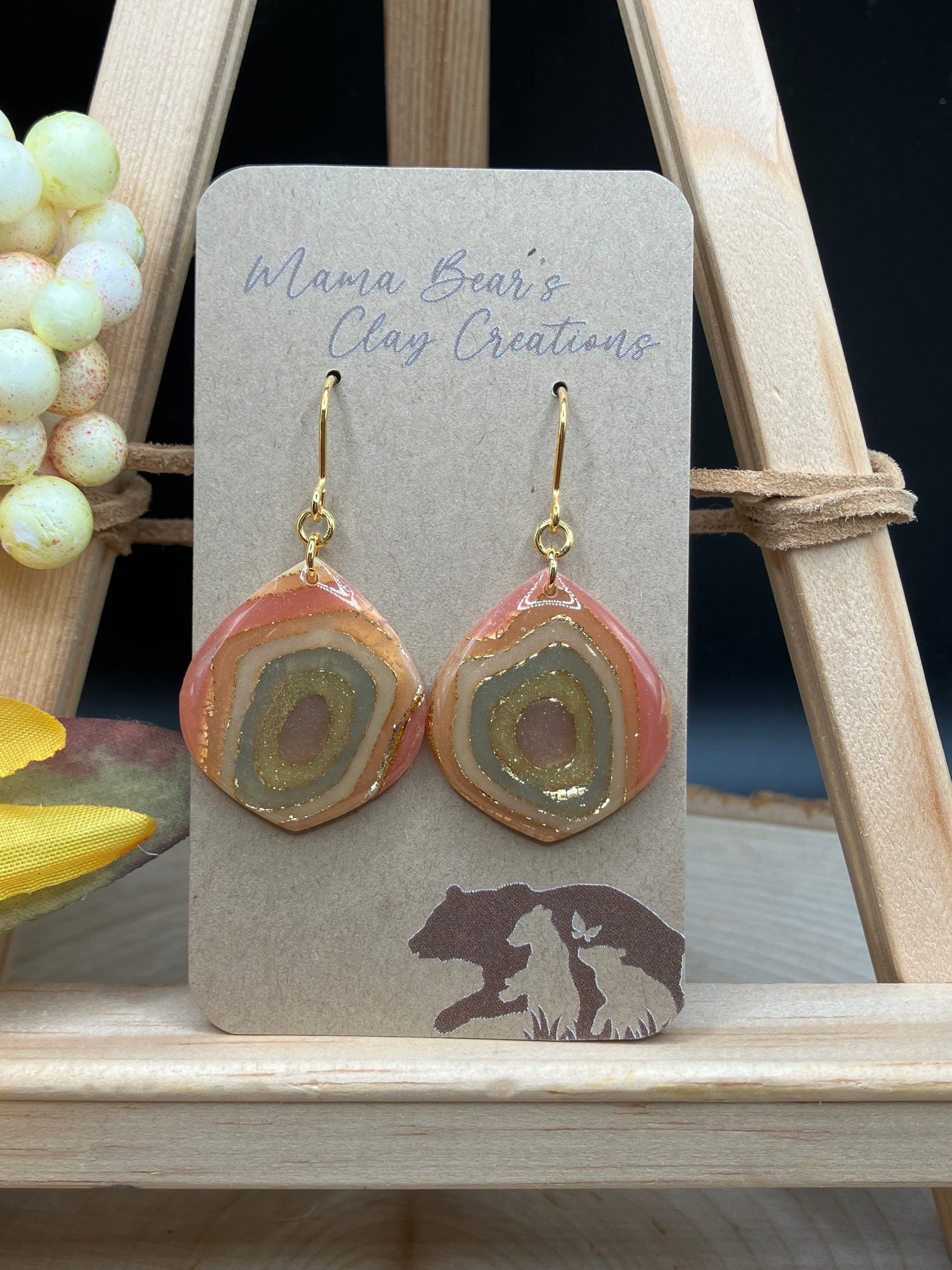 Custom tinted translucent earthy tones of red, orange, yellow, green and chocolate clay with layers of gold shimmering accents. Gold plated findings. 2" complete.