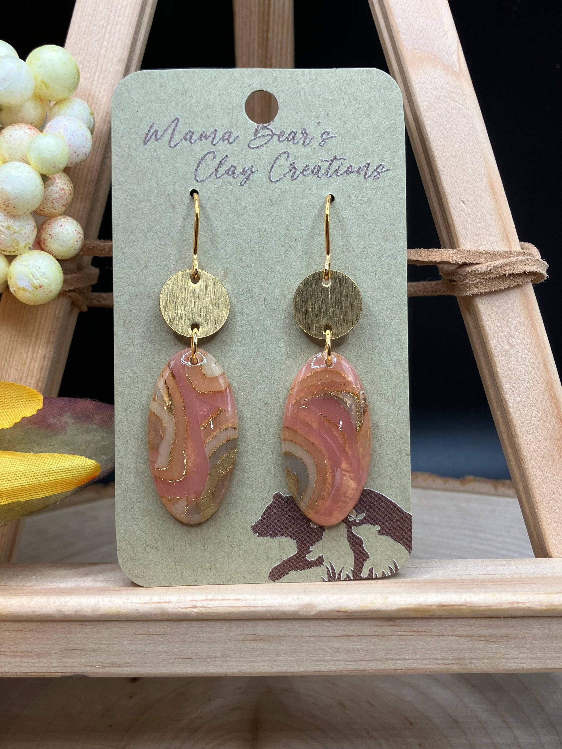 Custom tinted translucent earthy tones of red, orange, yellow, green and chocolate clay with layers of gold shimmering accents. Gold plated findings. 2.25" complete.