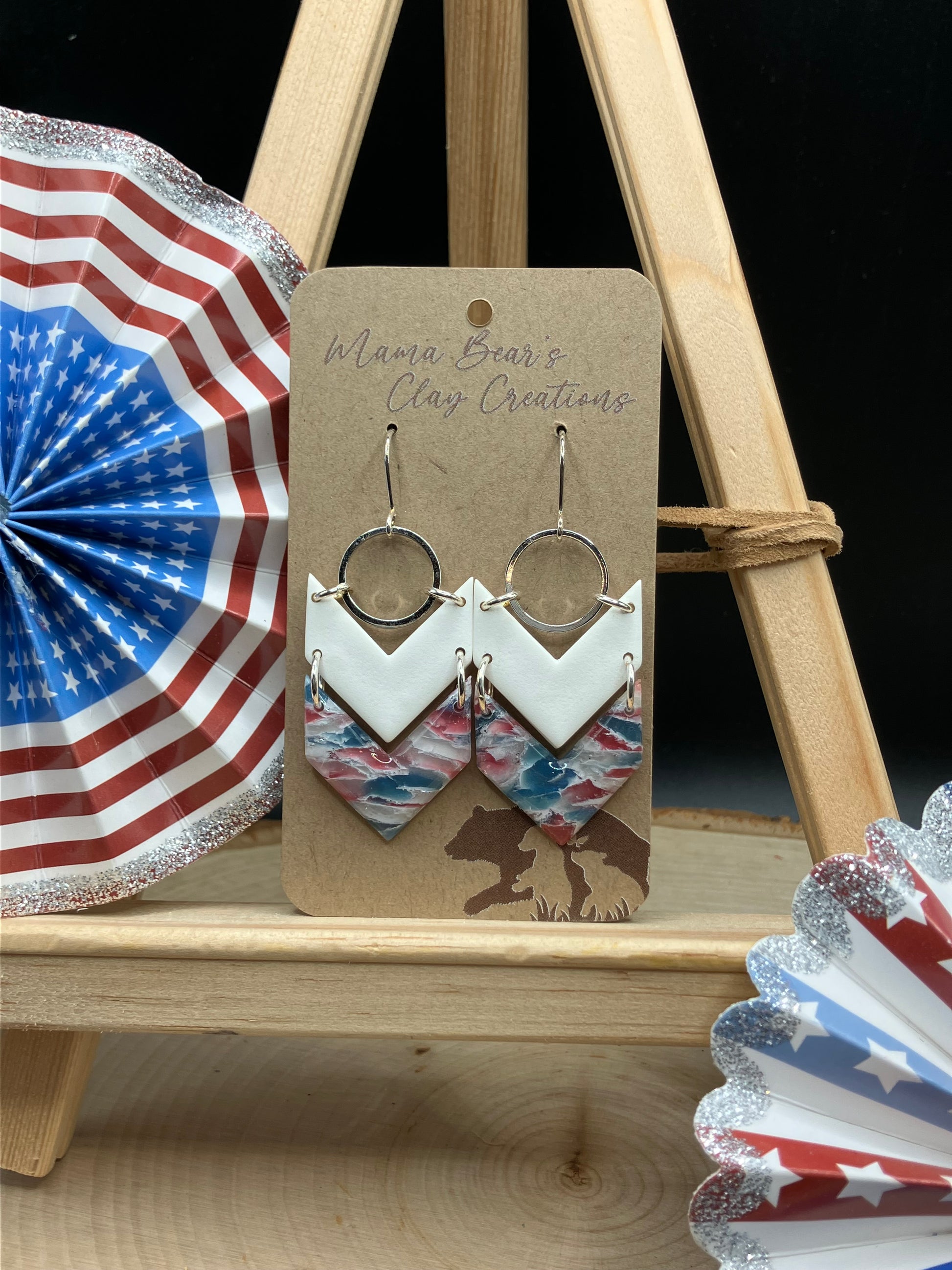 Translucent red, white and blue marbled. Topped with resin for high gloss shine. Silver plated findings. 2.5” complete.