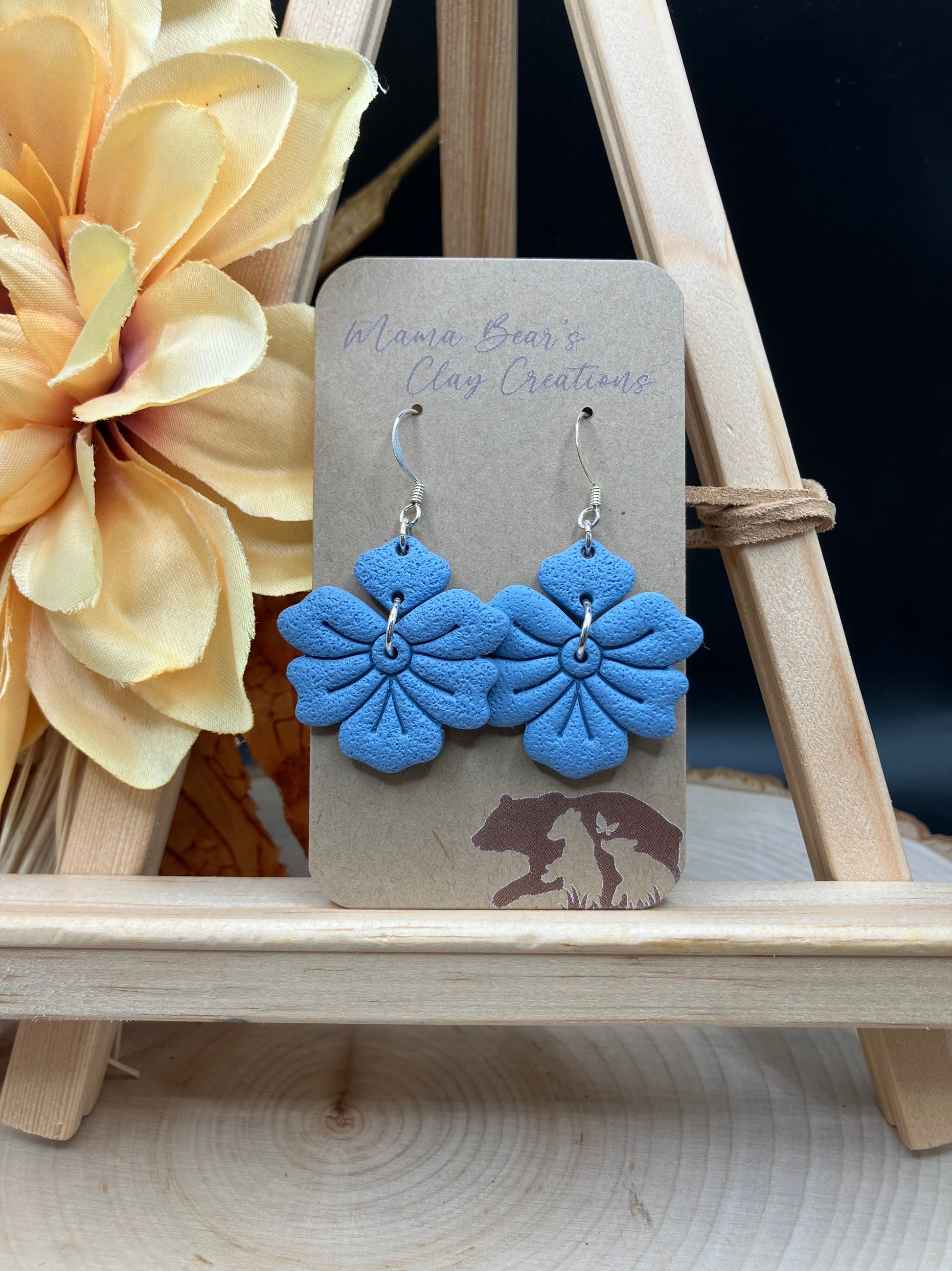 Two piece flower for cute dangle. Textured cornflower blue on silver plated findings. 2” complete.